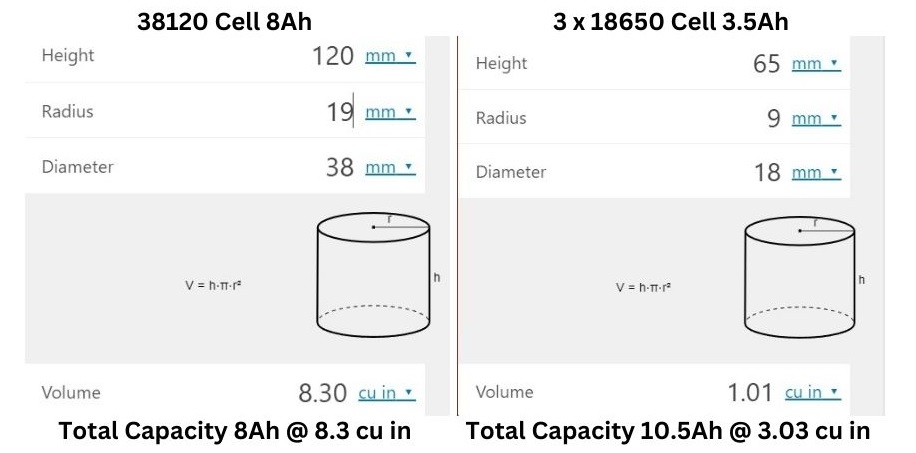The 18650 battery, typically associated with NMC (Nickel Manganese Cobalt) chemistry, is a prevalent choice in numerous high-drain devices and applications, such as laptops, power tools, and electric vehicles. NMC batteries are celebrated for their high energy density, which allows them to store a substantial amount of energy in a relatively compact form. NMC chemistry cells have an extremely high packing efficiency, 3 of the highest capacity 18650 cells would have more capacity than the 38120 cell at about 1/3rd or the space.