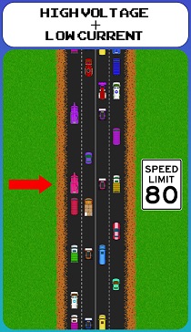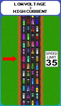 Watts are the measure of total power, and watts are found by multiplying the amps by the volts. If you are wondering, ‘What is the relationship between amps, volts, and watts?’, you can think of it like cars traveling down a highway. The density of the cars on the road is like the amps and the speed of the cars is like the volts. The overall amount of energy, if keeping with the analogy, would be the number of cars that pass a particular point (the red arrow).